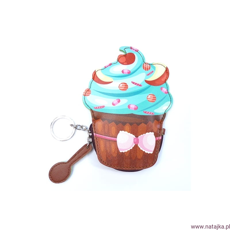 Oryginalny portfelik mini babeczka, w sam raz do małej torebeczki czy plecaka, z dodatkową zawieszką łyżeczką;
