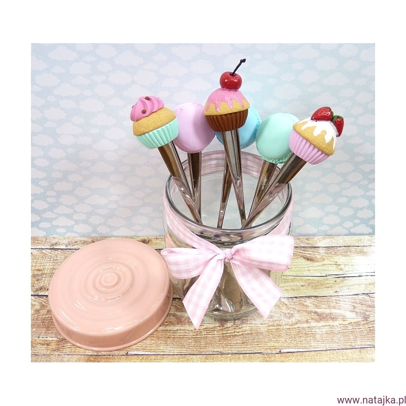 Łyżeczka do cukierniczki/deserów/kawy zdobiona słodyczami z wysokiej jakości masy termoutwardzalenj FIMO. Długość całkowita: ok. 15,5cm, średnica makaronika: 3cm. Nie należy myć w zmywarce.