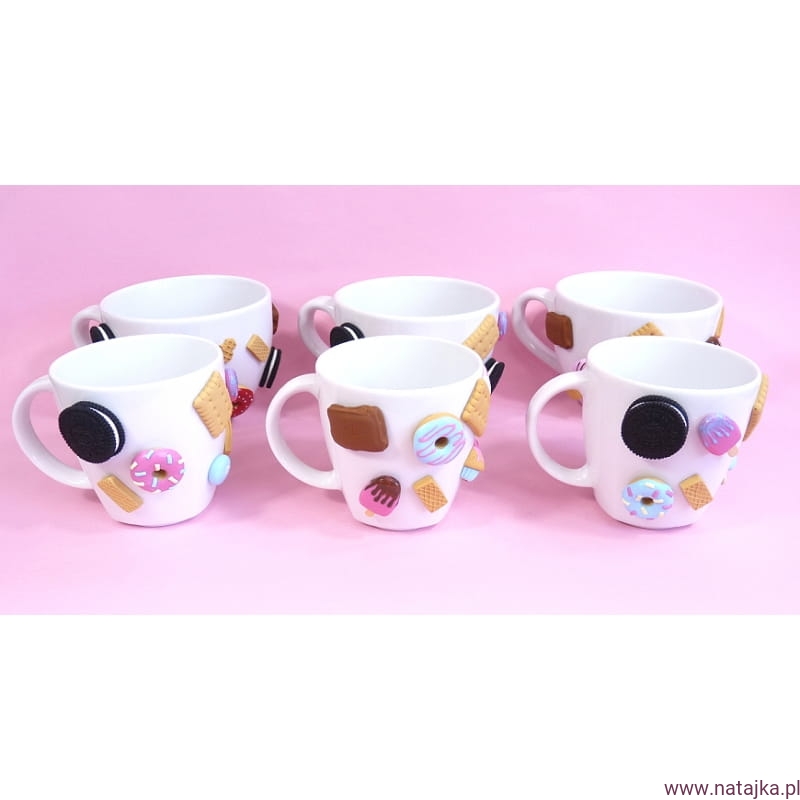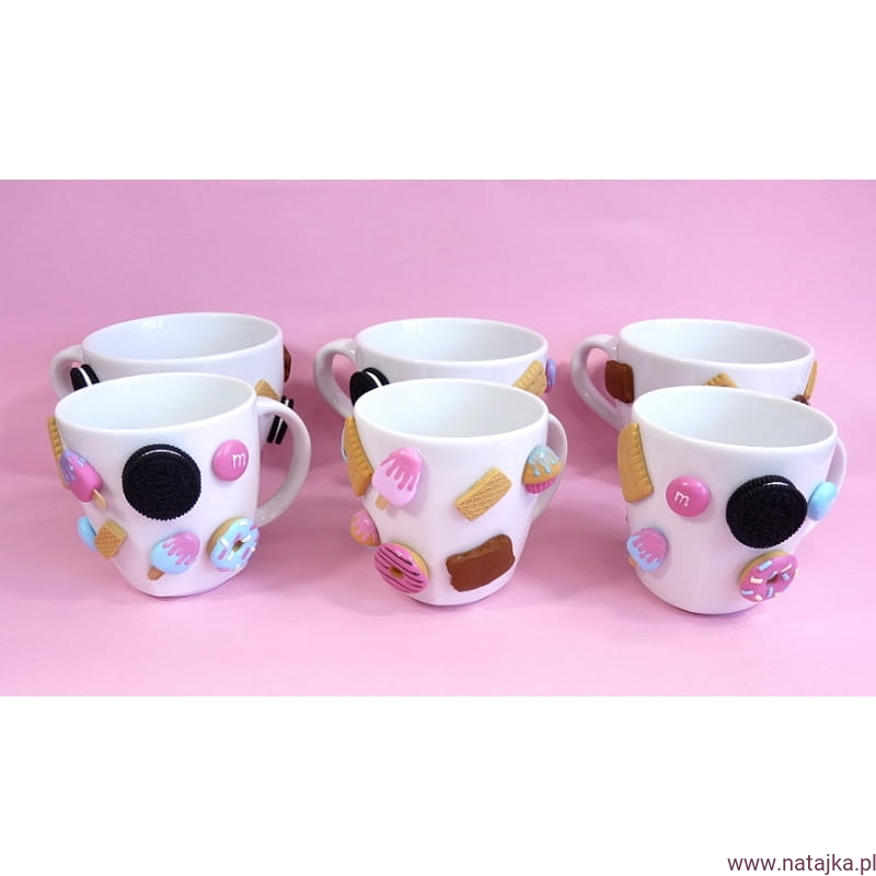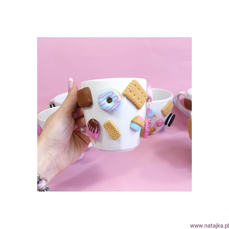 Oryginalny kubek zdobiony ręcznie robionymi słodyczami, wykonanymi z najwyższej jakości masy termoutwardzalnej FIMO. Elementy na kubku mocowane na specjalnym kleju, który według informacji producenta wytrzymuje temp. do 120st. Celsjusza, spokojnie więc wytrzyma wlany do kubka wrzątek. Kubek można myć w ciepłej wodzie z dodatkiem płynu do naczyń, nie należy go długo namaczać, nie nadaje się do mycia w zmywarce.