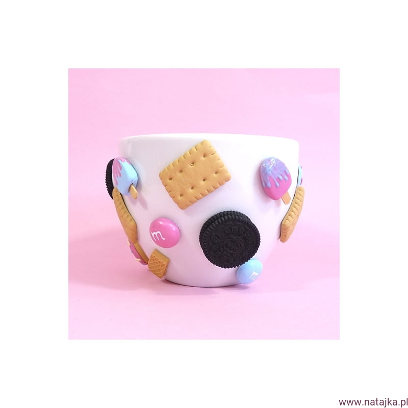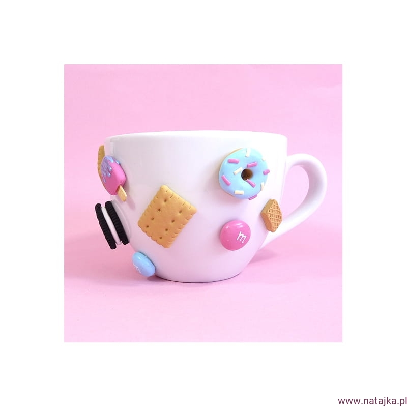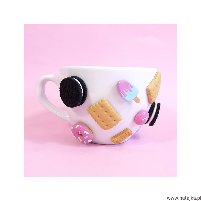 Oryginalny kubek zdobiony ręcznie robionymi słodyczami, wykonanymi z najwyższej jakości masy termoutwardzalnej FIMO. Elementy na kubku mocowane na specjalnym kleju, który według informacji producenta wytrzymuje temp. do 120st. Celsjusza, spokojnie więc wytrzyma wlany do kubka wrzątek. Kubek można myć w ciepłej wodzie z dodatkiem płynu do naczyń, nie należy go długo namaczać, nie nadaje się do mycia w zmywarce.
