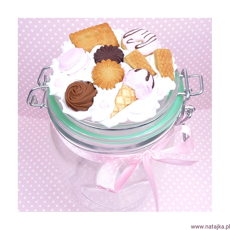 Zdobiony elementami z wysokiej jakości masy termoutwardzalnej FIMO, mocowanych trwale na silikonie. Poszczególnych elementów nie należy odrywać, wyrywać - każda próba ingerencji w kompozycję na pokrywie grozi połknięciem/ugryzieniem elementów przez dzieci.