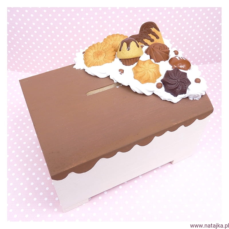 Drewniana skarbonka zdobiona ręcznie robionymi słodkościami :) na spodzie wysuwane dno, pozwalające na wyciągnięcie zawartości.