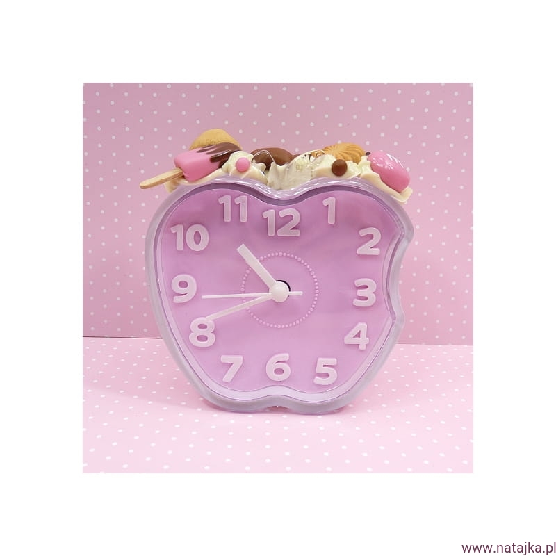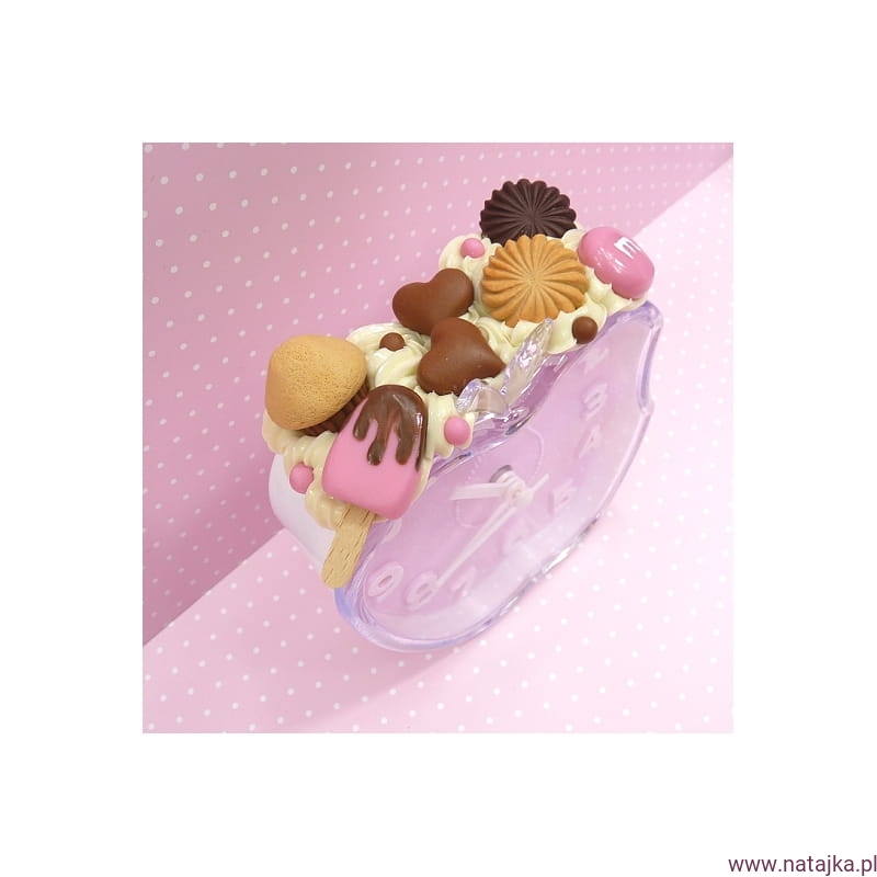 Uroczy budzik, zdobiony miniaturowymi słodkościami. Zasilany jedną baterią AA 1,5V, bateria w zestawie.