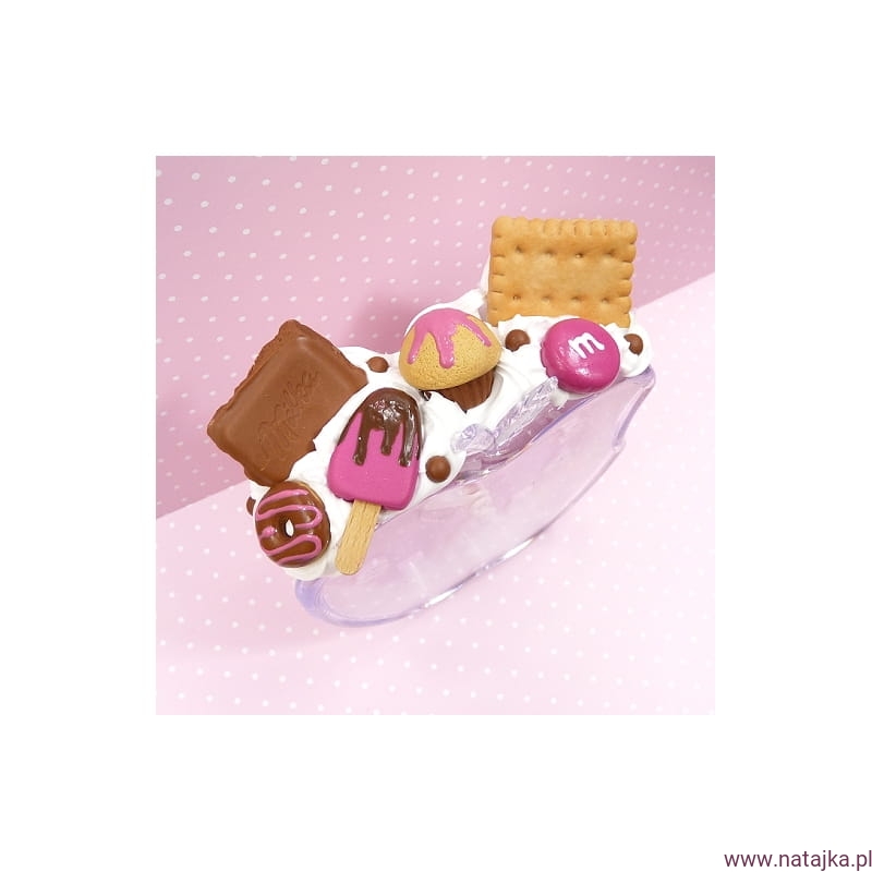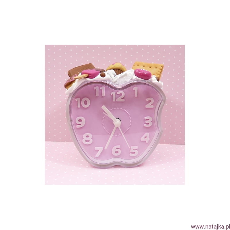 Uroczy budzik, zdobiony miniaturowymi słodkościami. Zasilany jedną baterią AA 1,5V, bateria w zestawie.