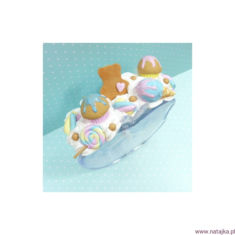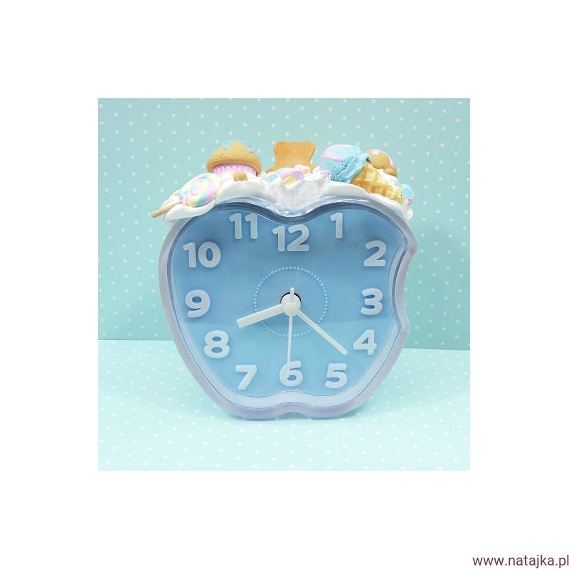Uroczy budzik, zdobiony miniaturowymi słodkościami. Zasilany jedną baterią AA 1,5V, bateria w zestawie.