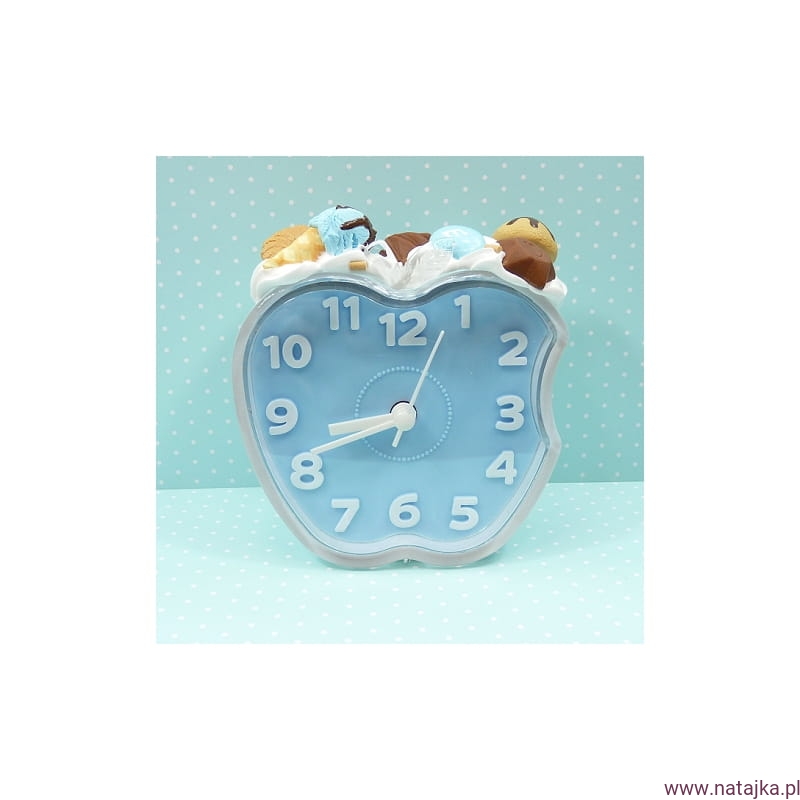 Uroczy budzik, zdobiony miniaturowymi słodkościami. Zasilany jedną baterią AA 1,5V, bateria w zestawie.