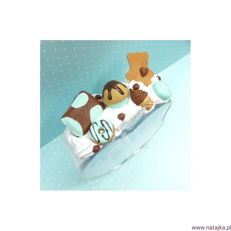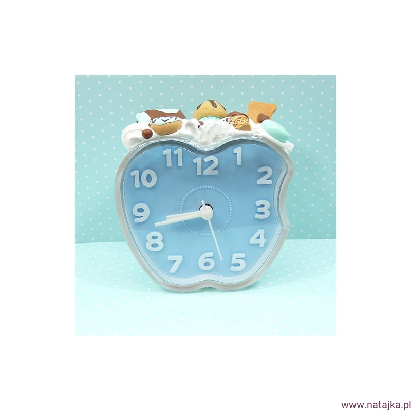 Uroczy budzik, zdobiony miniaturowymi słodkościami. Zasilany jedną baterią AA 1,5V, bateria w zestawie.