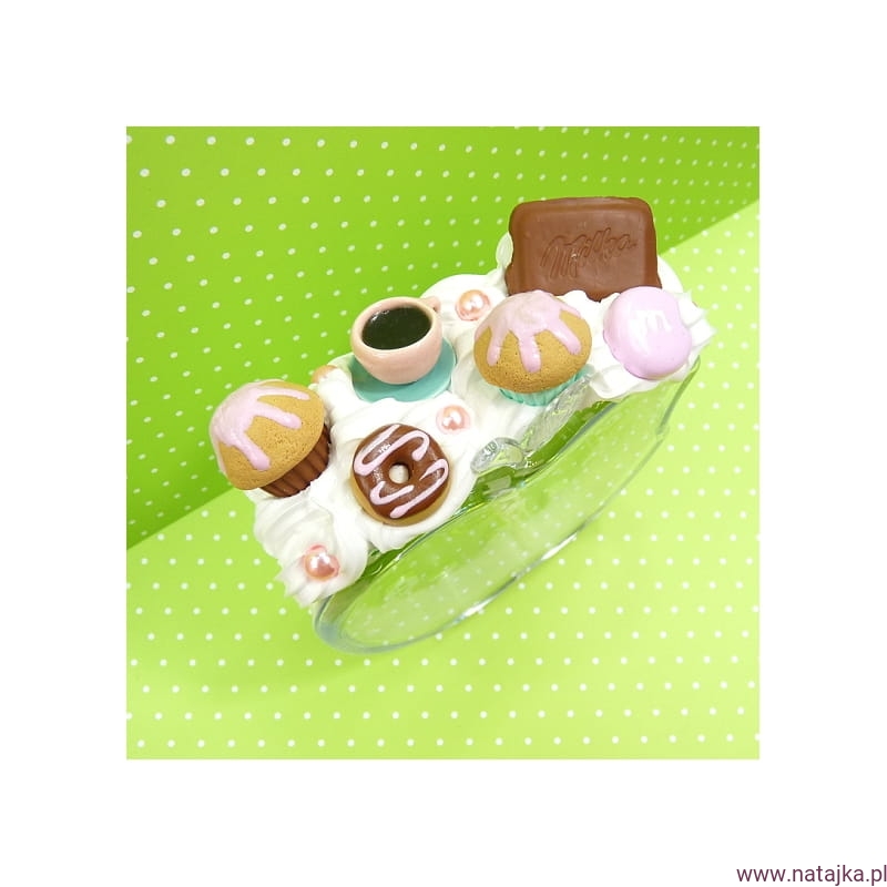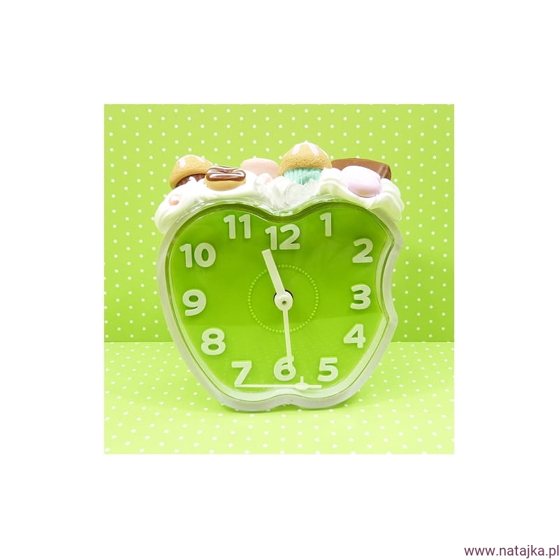 Uroczy budzik, zdobiony miniaturowymi słodkościami. Zasilany jedną baterią AA 1,5V, bateria w zestawie.