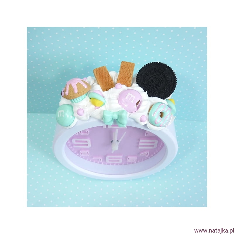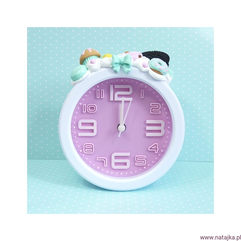 Uroczy budzik, zdobiony miniaturowymi słodkościami. Zasilany jedną baterią AA 1,5V, bateria w zestawie.