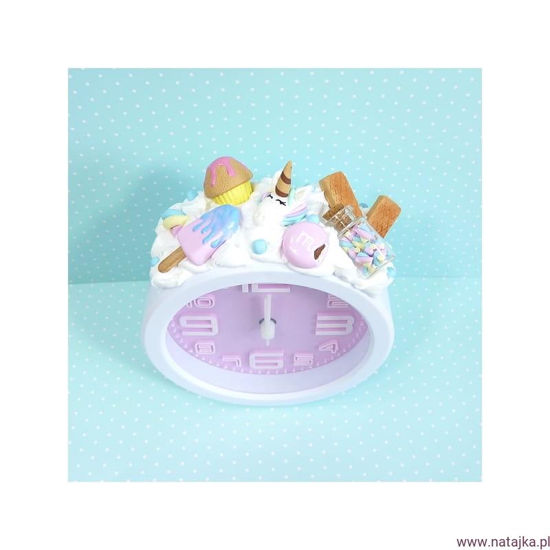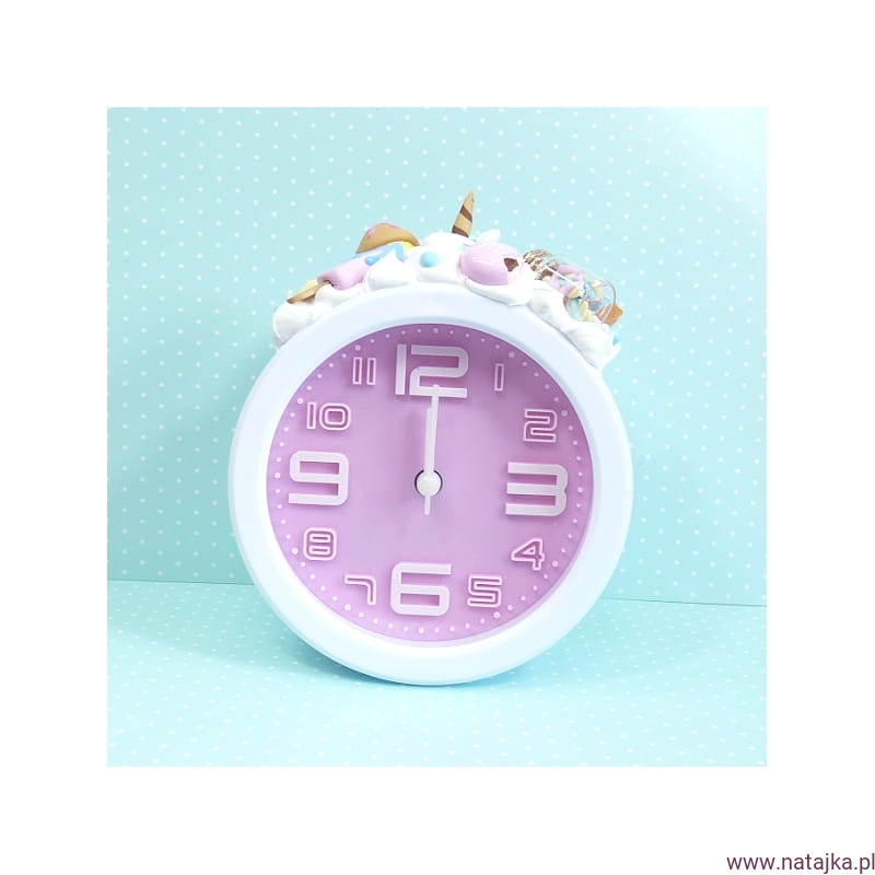 Uroczy budzik, zdobiony miniaturowymi słodkościami. Zasilany jedną baterią AA 1,5V, bateria w zestawie.