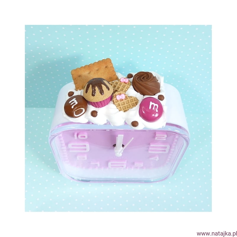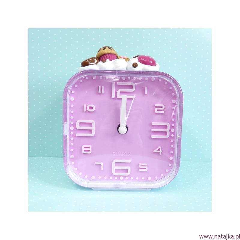 Uroczy budzik, zdobiony miniaturowymi słodkościami. Zasilany jedną baterią AA 1,5V, bateria w zestawie.