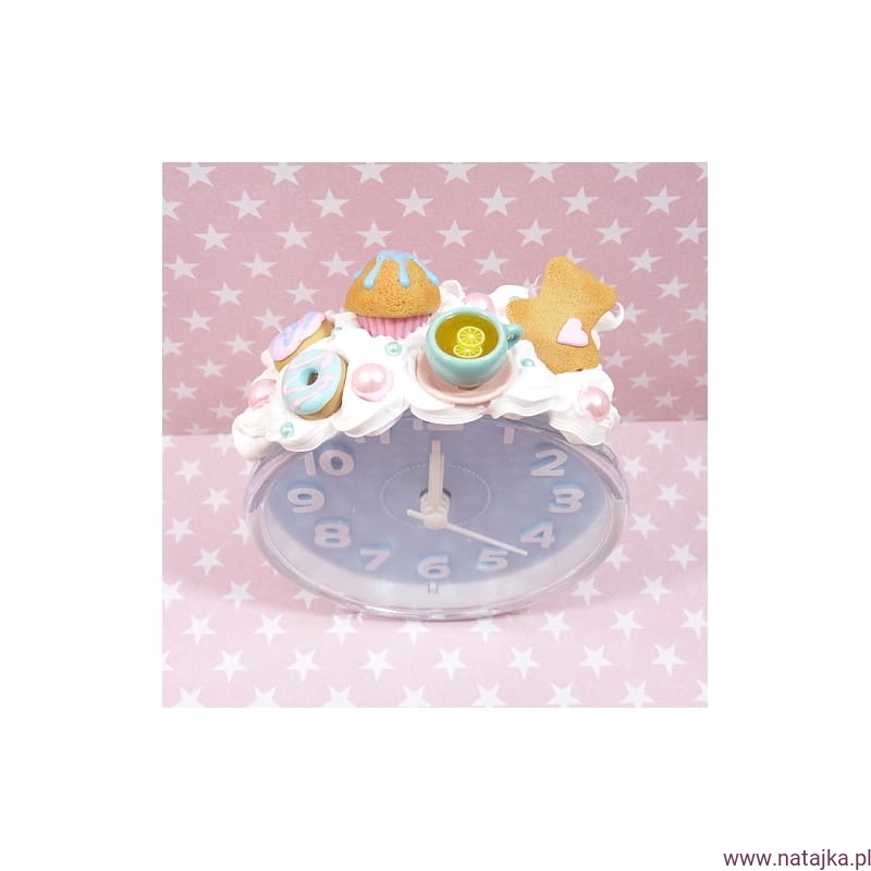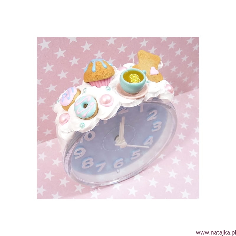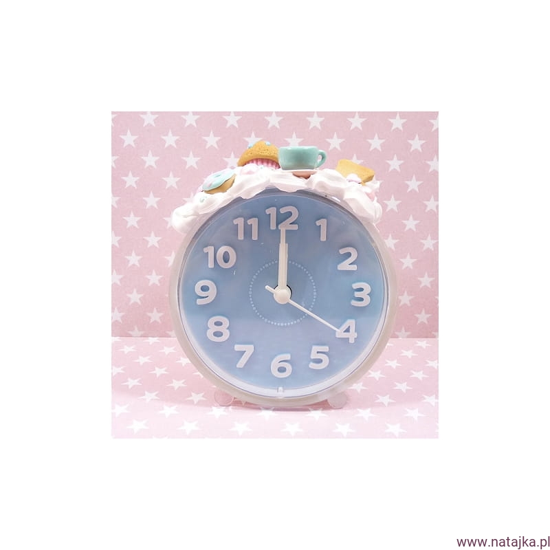 Uroczy budzik, zdobiony miniaturowymi słodkościami. Zasilany jedną baterią AA 1,5V, bateria w zestawie.