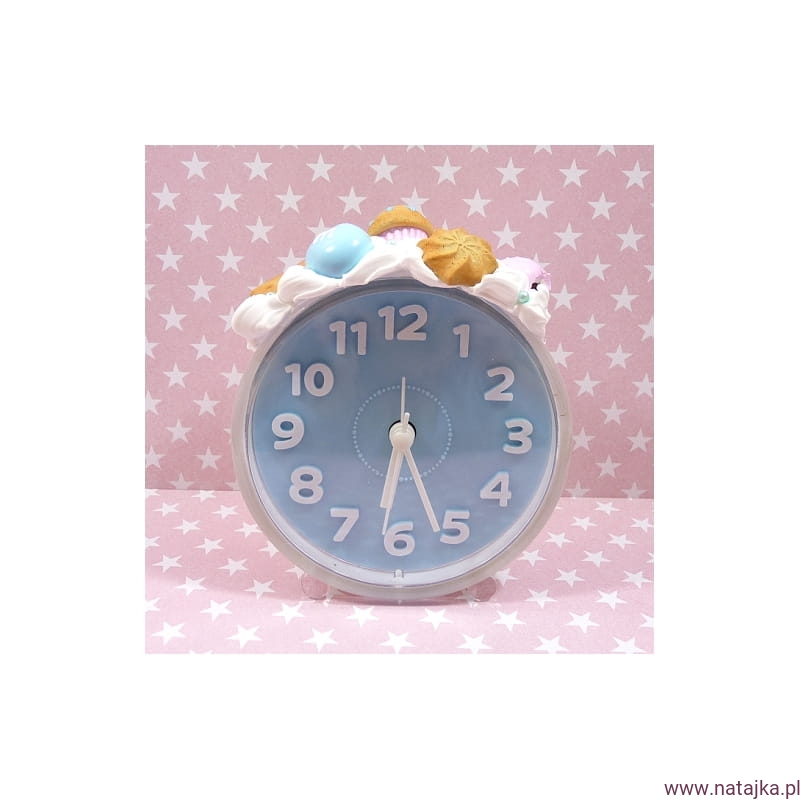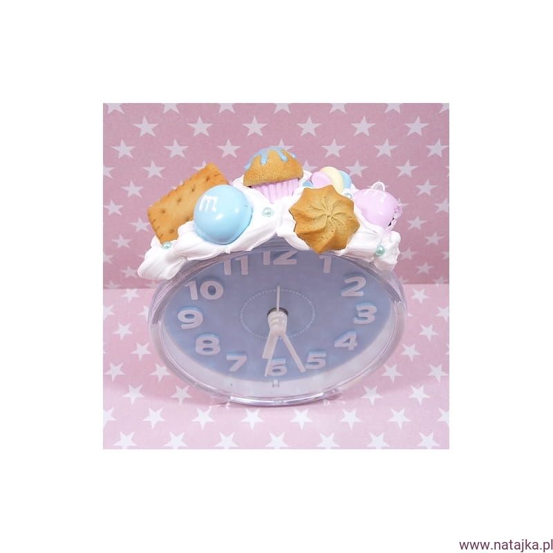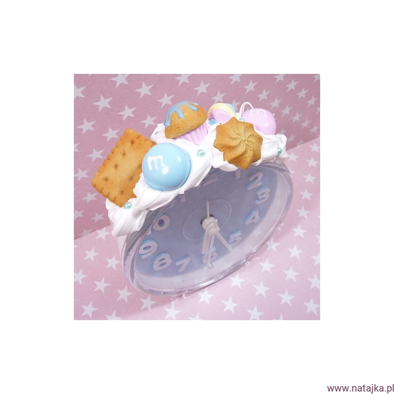 Uroczy budzik, zdobiony miniaturowymi słodkościami. Zasilany jedną baterią AA 1,5V, bateria w zestawie.
