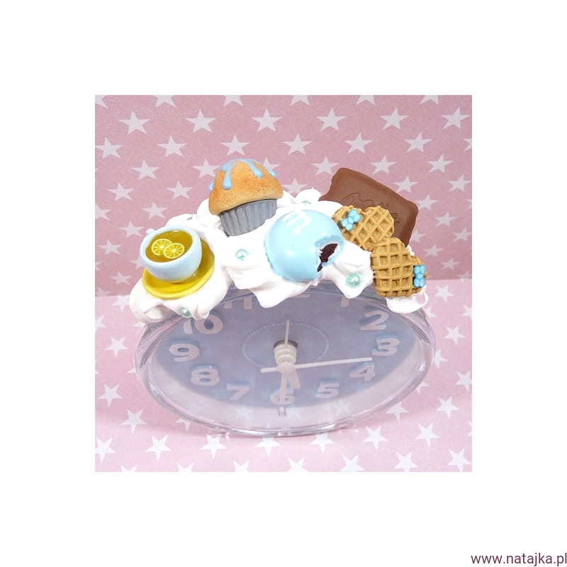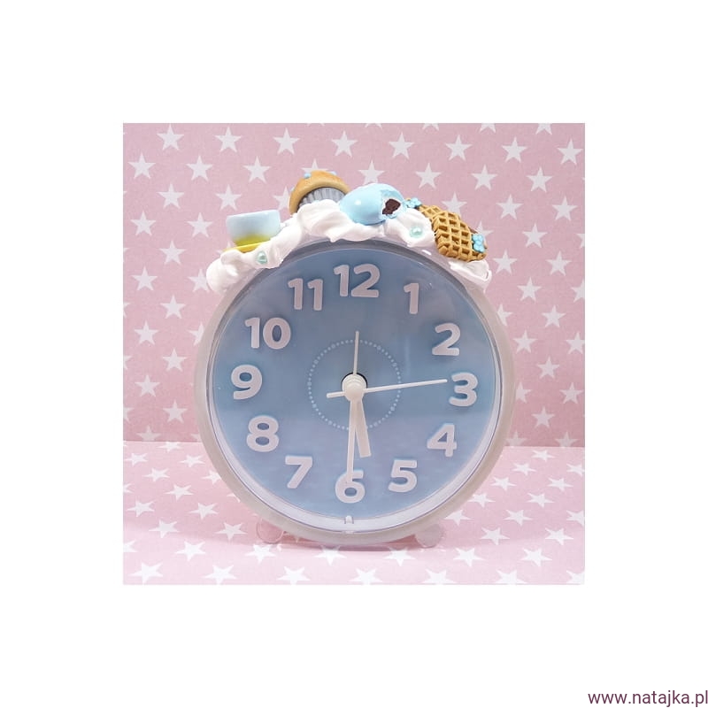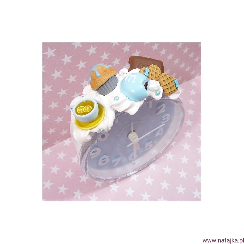Uroczy budzik, zdobiony miniaturowymi słodkościami. Zasilany jedną baterią AA 1,5V, bateria w zestawie.