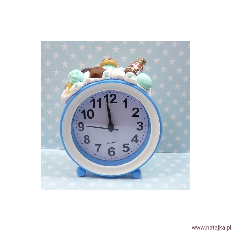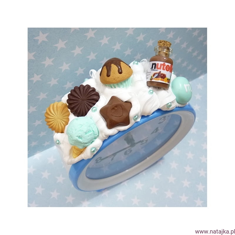 Materiały: budzik plastikowy, elementy z wysokiej jakości masy termoutwardzalnej FIMO