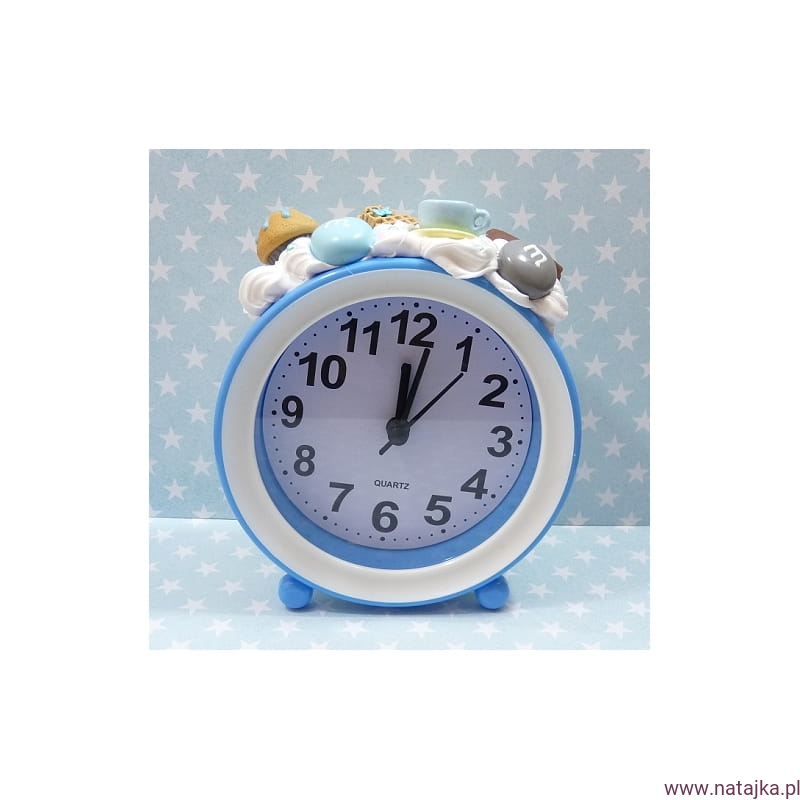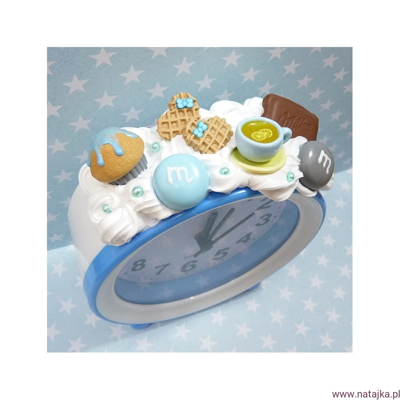 Uroczy budzik, zdobiony miniaturowymi słodkościami. Zasilany jedną baterią AA 1,5V, bateria w zestawie.