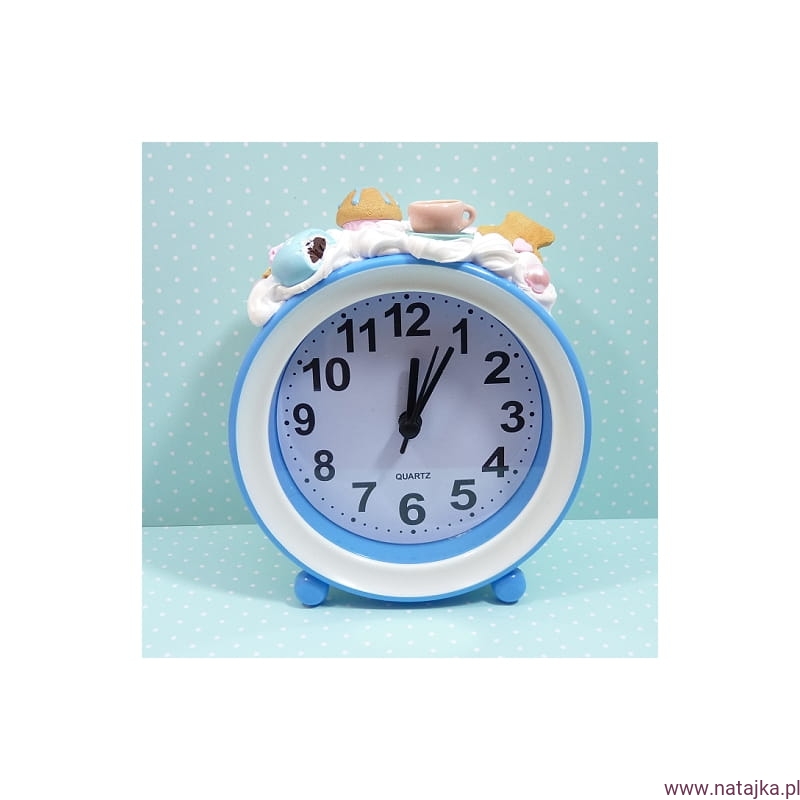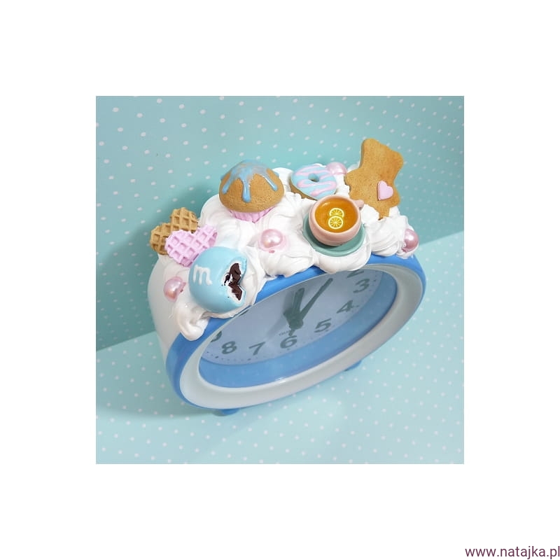 Uroczy budzik, zdobiony miniaturowymi słodkościami. Zasilany jedną baterią AA 1,5V, bateria w zestawie.